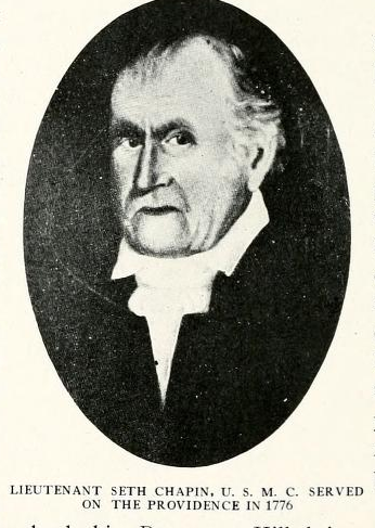 Chapin’s service aboard the Providence is clouded by conflicting accounts. A sergeant in his detachment, cited in Chapin’s pension records, claimed that Chapin “broke” in December 1776, with the sergeant allegedly promoted into his position. However, another source places Second Lieutenant Chapin at the court-martial of Navy Lieutenant Richard Marvin aboard the Providence on April 3, 1777, off Field’s Point in the Providence River.